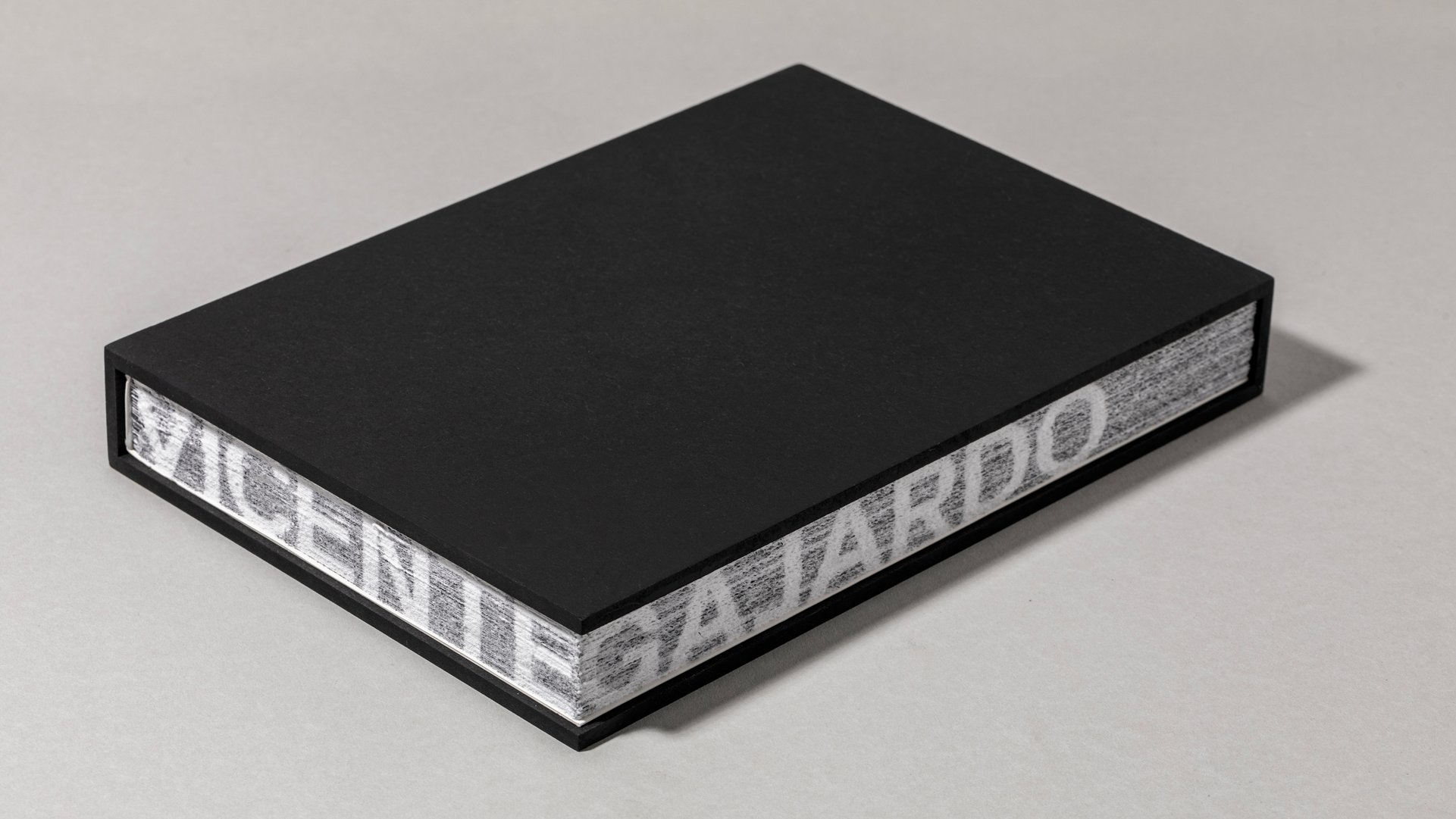 Vicente Gajardo é um renomado escultor chileno que trabalha principalmente com pedra. Esta antologia comunica a sua obra interpretando-a graficamente. A caixa preta exterior é uma referência simbólica ao granito presente na sua obra e contrasta com o papel branco macio da capa e do miolo. Texto e imagens preenchem a página até às margens, evocando a tensão da escultura em pedra. Abrir um novo livro exige manualidade: cada folha deve ser cortada para revelar o conteúdo, num procedimento lento e cuidadoso, tal como o do escultor face à pedra, produzindo-se uma textura rica nos cortes (frente, cabeça e pé). A frente e a cabeça são impressas com o nome do escultor. As obras foram fotografadas por Alexandre Delmar, sob direção artística, dando coerência visual ao conjunto.
